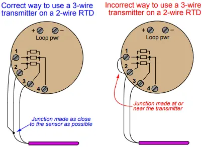 The following illustrations show both correct and incorrect ways to connect a 2-wire RTD to a 3- or 4-wire transmitter: